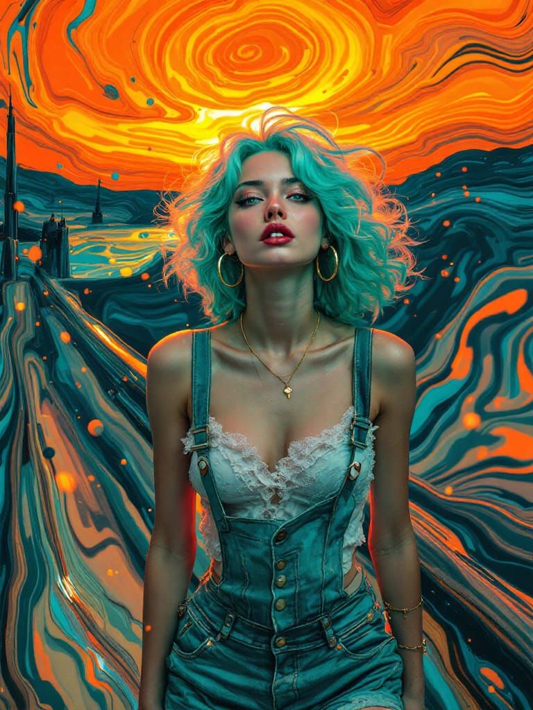 This expressionist portrait features a woman with mint-blue hair, rendered with distorted perspective and swirling backgrounds in bold oranges and blues, evoking intense emotion.