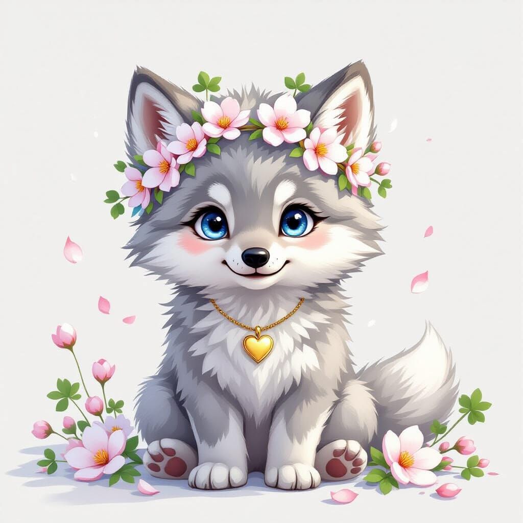 This image shows a fluffy wolf cub with sapphire eyes wearing a cherry blossom crown. The artwork is reminiscent of alcohol ink paintings using soft, diffused lighting and scattered floral elements.