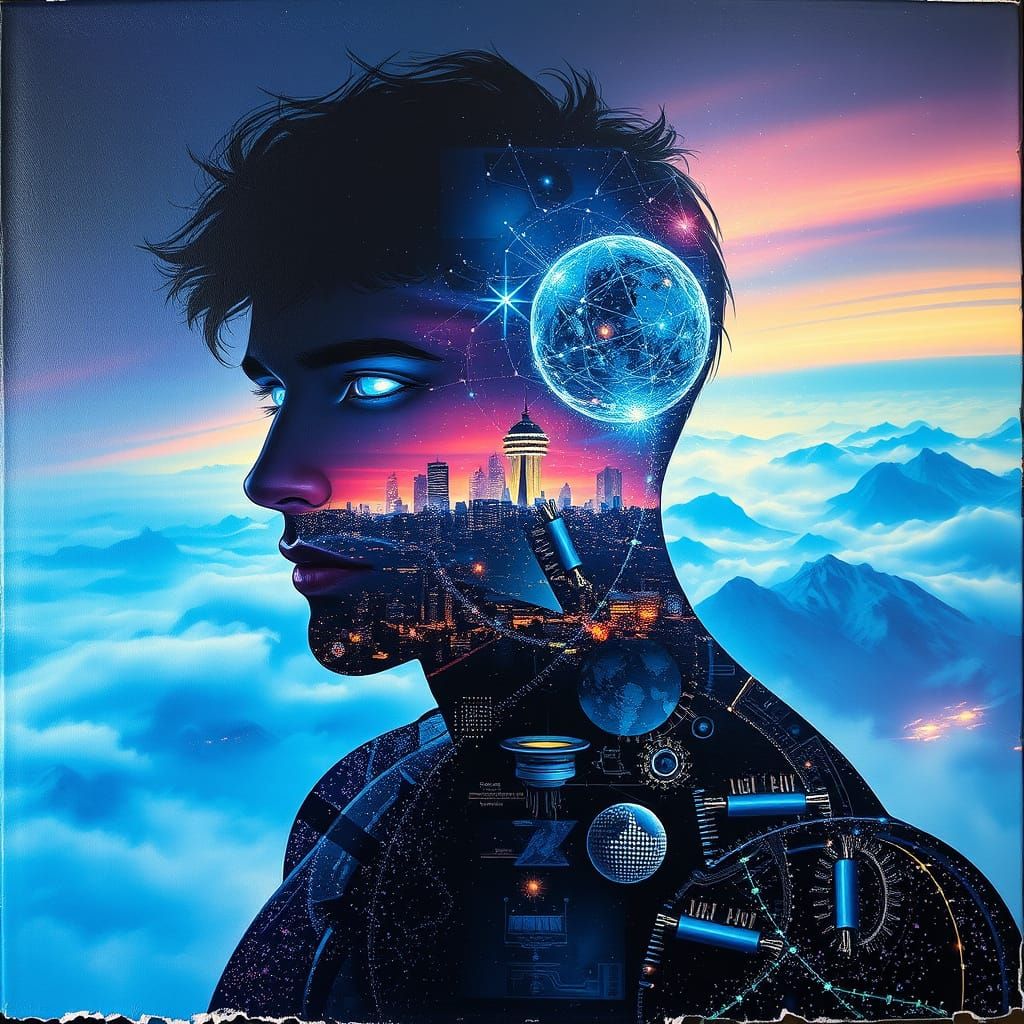 This image shows a cyber-enhanced figure standing amidst a neon-drenched cityscape, with glowing blue eyes that hold ancient secrets. Rendered in a bold, textured style, the figure dissolves into a mystical landscape of mountains and clouds, lit by celestial glows and faint auroras.