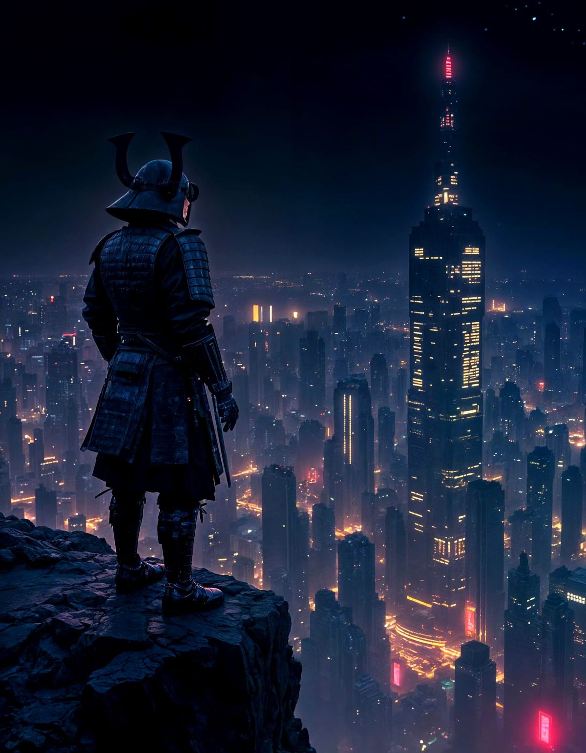 This image shows a solitary samurai warrior gazing over a sprawling, neon-illuminated city. This cinematic photograph captures a futuristic and melancholic scene with high contrast, volumetric lighting, and Blade Runner-inspired aesthetics.
