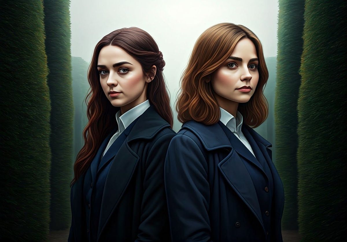 A haunting portrait of two women, Ashildr and Clara, walking through a mystical alien maze on a misty day, inspired by Pre-Raphaelite and fine art styles, with rich colors and exquisite detail