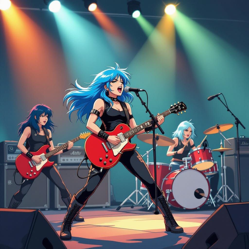 This image captures an all-female heavy metal band performing live in an energetic 1980s anime aesthetic. Features dynamic action, bold colors, and dramatic stage lighting.