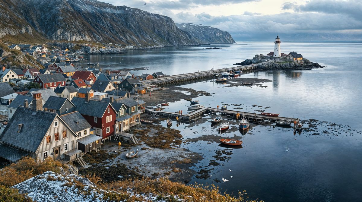 A serene aerial view of a traditional Norwegian harbor at sunrise, where ancient stone and weathered wood blend with the calm fjord waters, surrounded by colorful houses, fishermen, and a proud lighthouse.