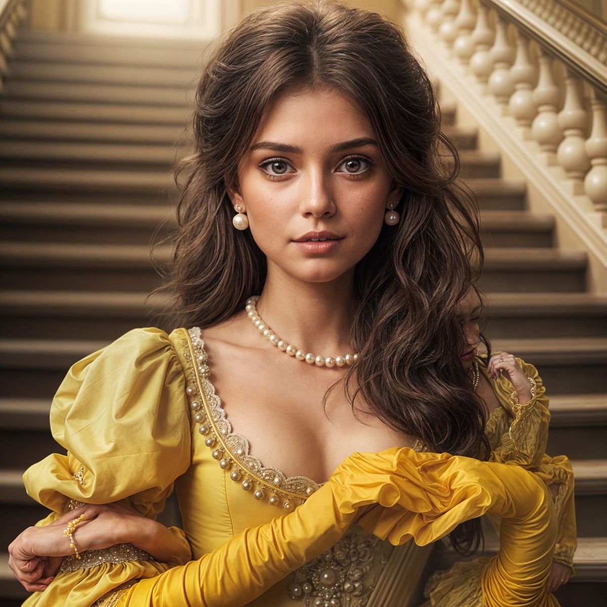 A young woman with fair skin and brown hair, wearing a yellow dress with puffy sleeves and a pearl necklace, stands in an elegant pose on a grand staircase with ornate railings. Her gaze is directed towards the viewer, and she has a subtle smile on her lips