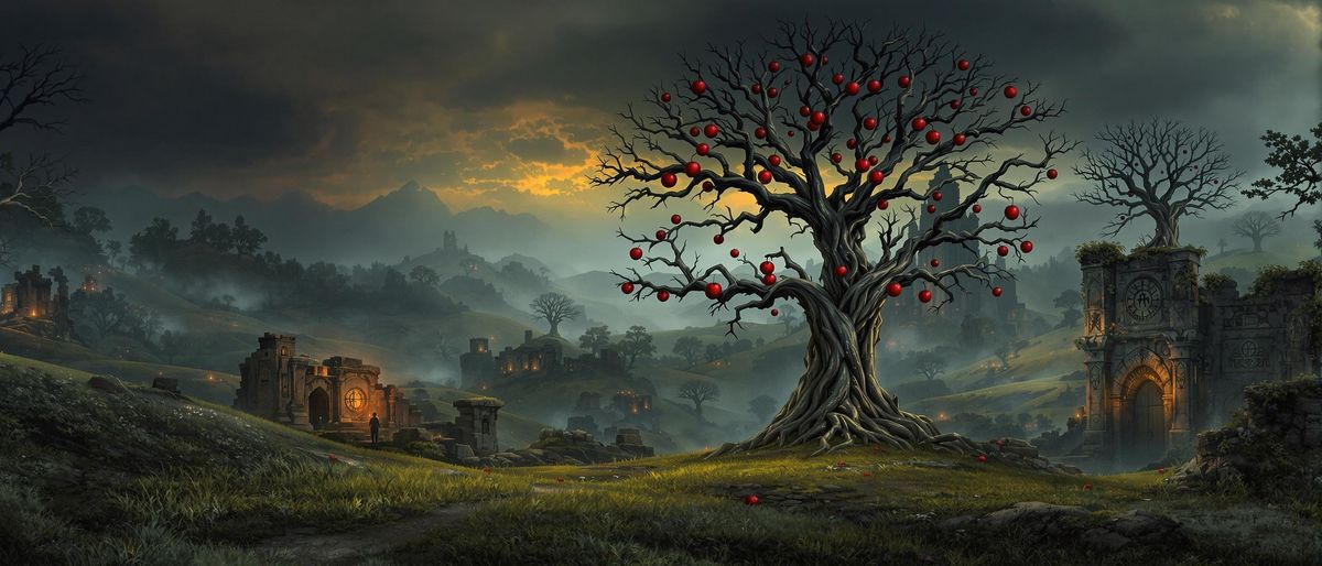 A captivating view of a mystical landscape featuring rolling hills, mist-covered forests, and ancient ruins under a darkening sky. Silver trees with red apples add to the otherworldly atmosphere.