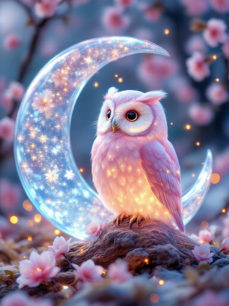 A vibrant double exposure image features a pastel owl perched in a glass crescent moon. The dreamy, magical landscape includes cherry blossoms, intricate details, and a soft, glowing light.