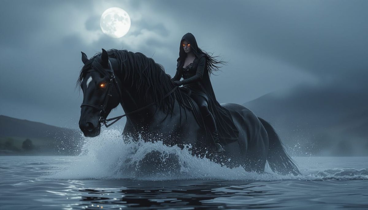A colossal, feral black water horse, the Each-Uisge, rises from a loch with glowing eyes and bared teeth. A shrouded rider sits atop as mist and moonlight create a dark Celtic fantasy scene.