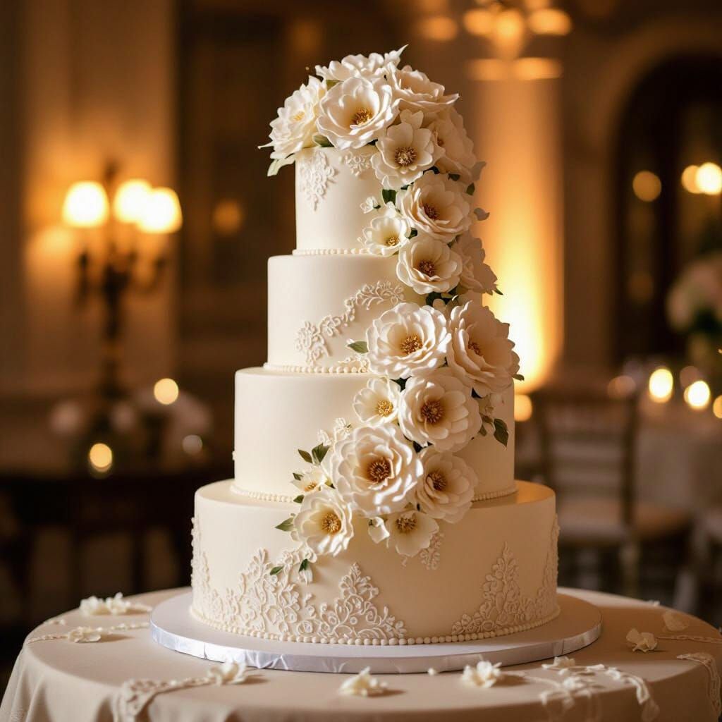 This image shows a multi-tiered wedding cake decorated with sugar flowers and lace details. The cake is bathed in soft, warm light, rendered with a whimsical and romantic aesthetic.
