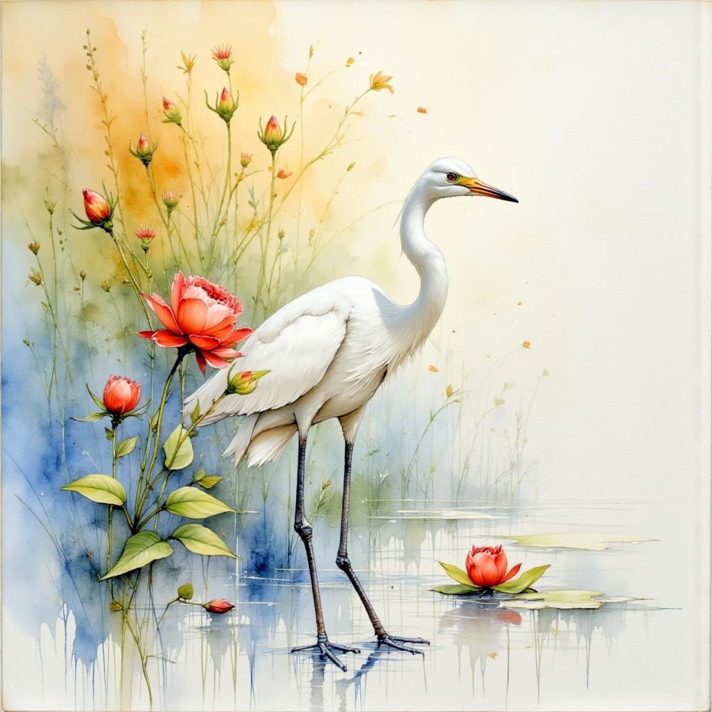 This image features a serene egret surrounded by vibrant roses, captured in a dreamy, pastel watercolor style reminiscent of Claude Monet's Impressionist works.