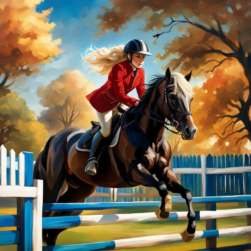 A striking picture of a blonde girl in riding gear jumping a black horse over a blue and white fence. This equestrian art features dramatic lighting and soft focus, rendered as a dynamic oil painting.