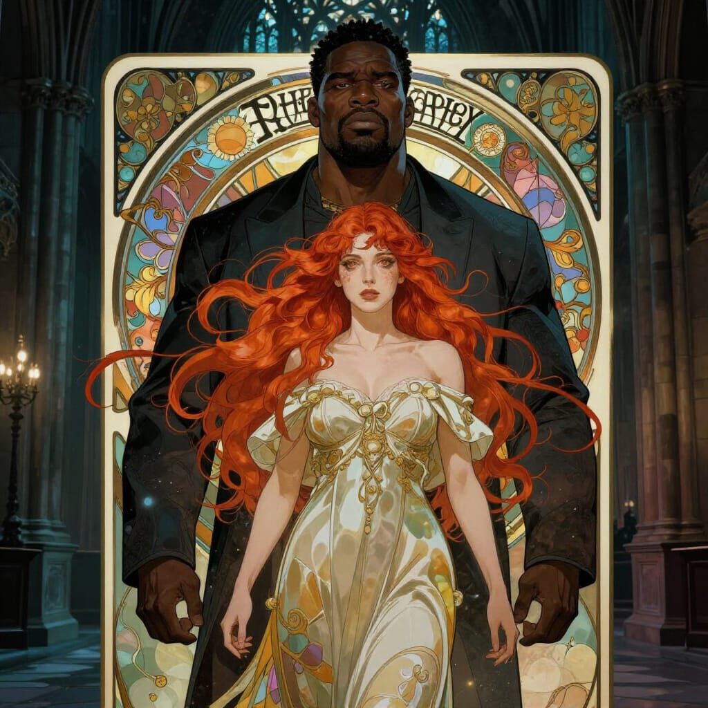This image shows a burly Black man and a red-headed woman in a dimly lit cathedral at night. Rendered with intricate detail and volumetric lighting for an ethereal atmosphere.
