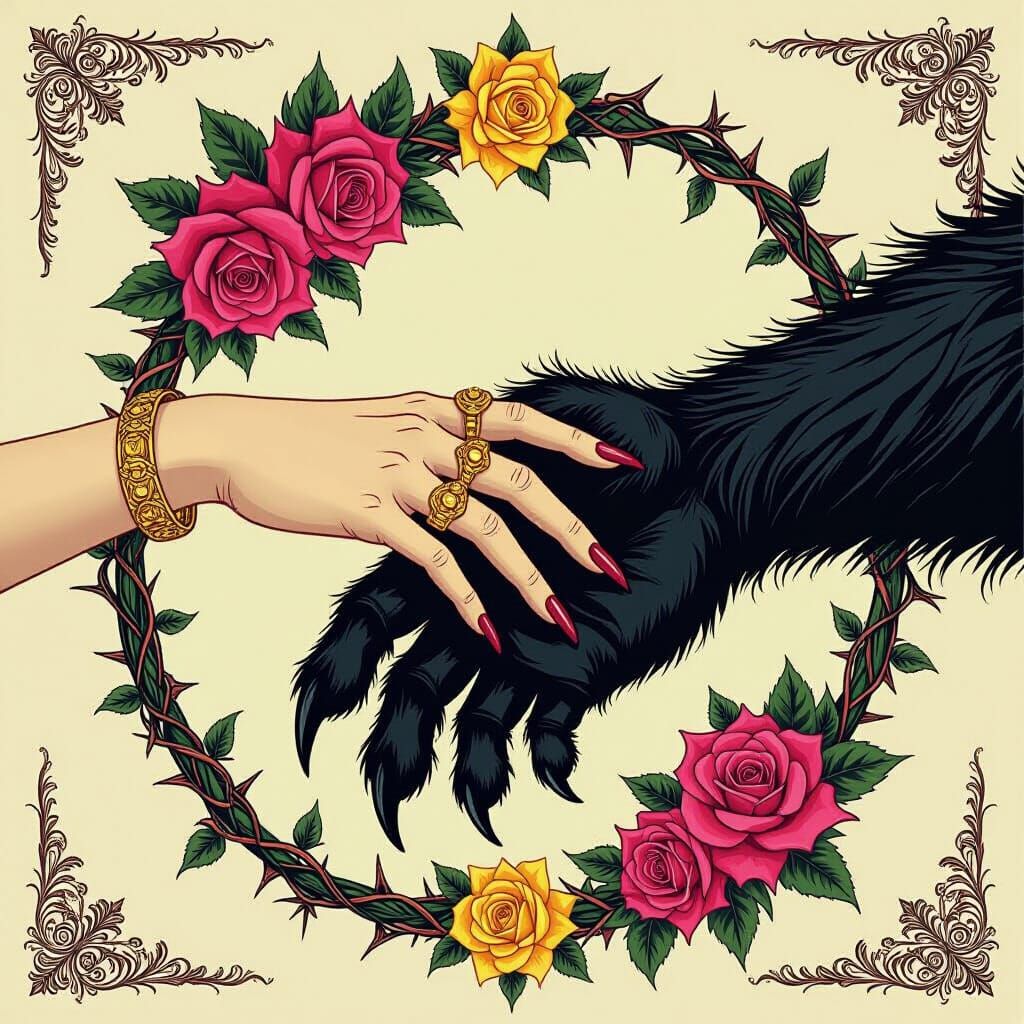 A striking digital art piece depicts a delicate female hand with gold rings holding a werewolf's clawed hand. Roses and thorny vines create a dramatic, high-contrast Gothic fantasy scene with cinematic lighting.