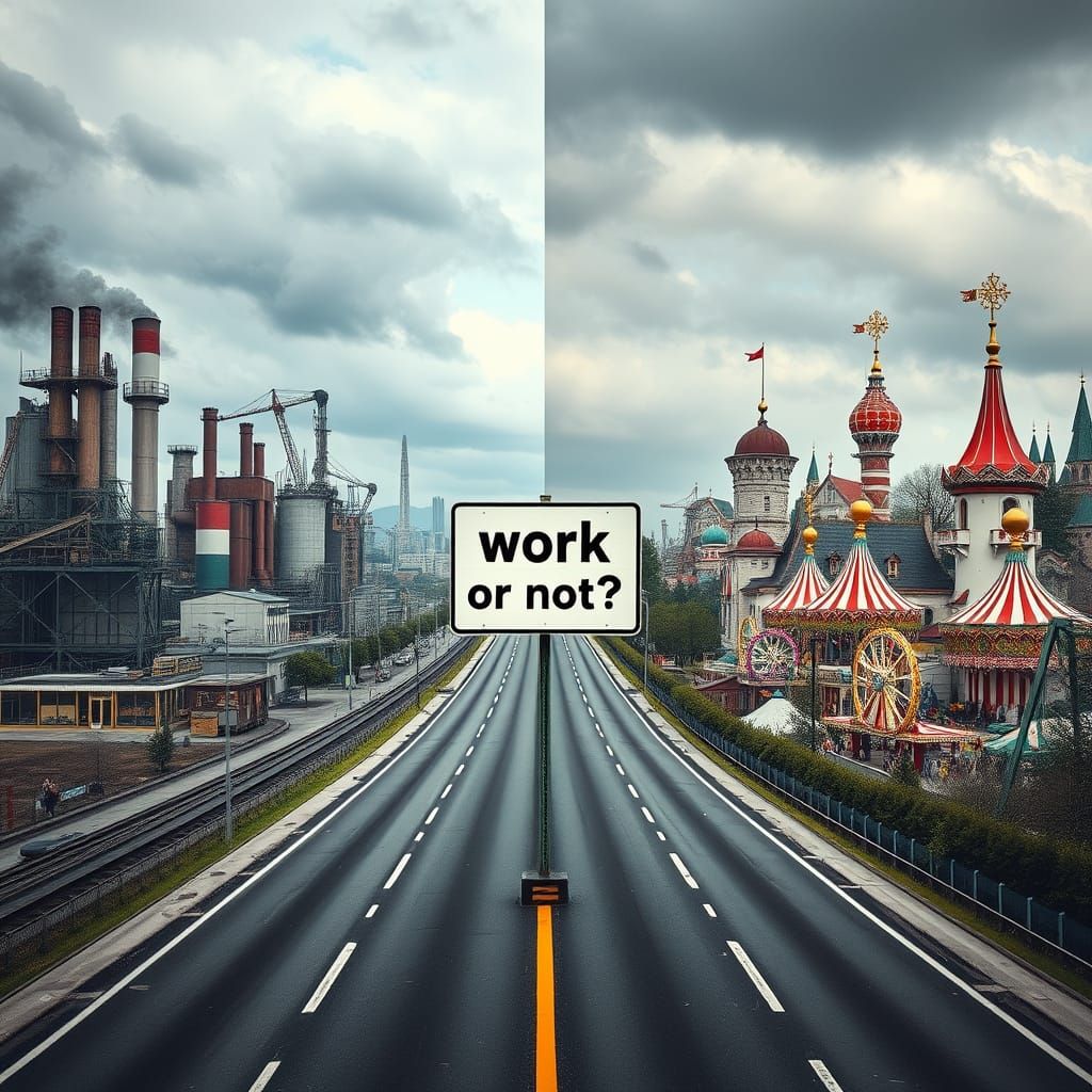 This image depicts a city split in two by a road, with a grim industrial landscape on one side and a vibrant, fairy-tale town with an amusement park on the other, highlighting the stark contrast between work and leisure.