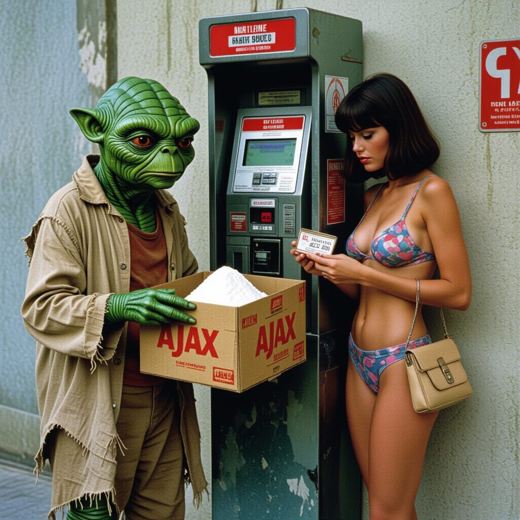 This image shows E.T. as a down-on-his-luck salesman in a gritty cityscape. The scene evokes a dystopian future in a cyberpunk aesthetic, next to an old payphone and a woman with a purse.