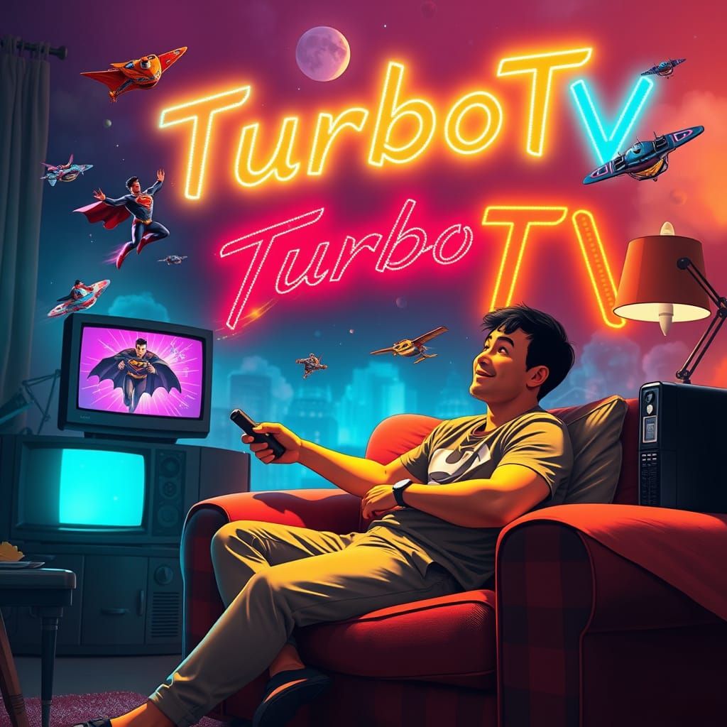 A young man is transported to a world of fantasy, surrounded by iconic comic book characters, vibrant lights, and retrofuturistic landscapes, as he discovers the limitless possibilities of TurboTv.