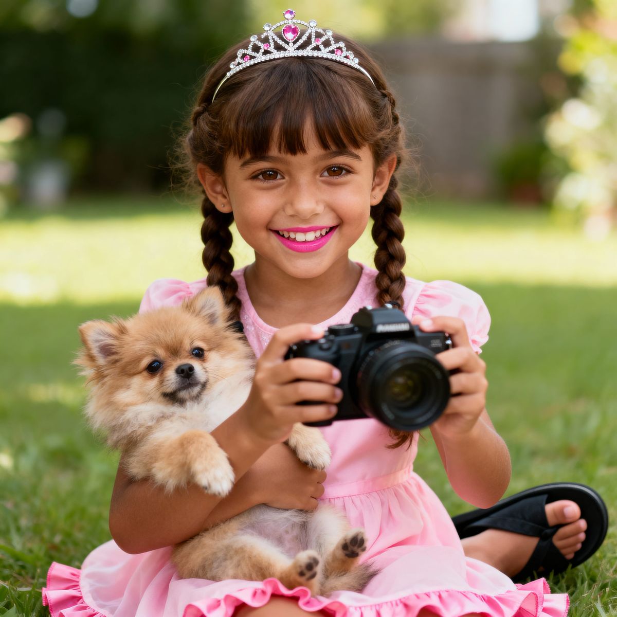 This image features a young girl with brown braids, wearing a pink dress and tiara, holding a dog while smiling. Her light brown skin and brown eyes are prominent.