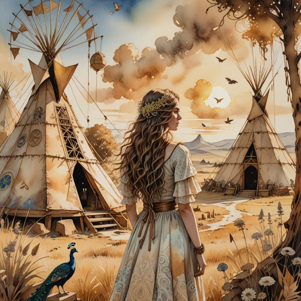 This image shows a distant monochromatic watercolor landscape featuring a person with long curly hair near a tipi. The scene incorporates steampunk elements, birds, butterflies, and tarot cards under warm sunlight, with a dreamy, vintage aesthetic.