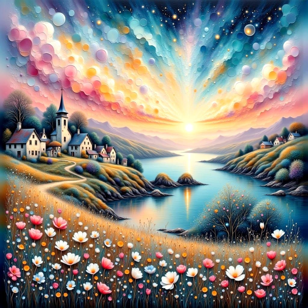 This image features an abstract landscape with a pastel dusk sky, white poppies, and a seaside village illuminated by lanterns and fairy lights. Created with a blend of watercolor, ink, and oil painting techniques.