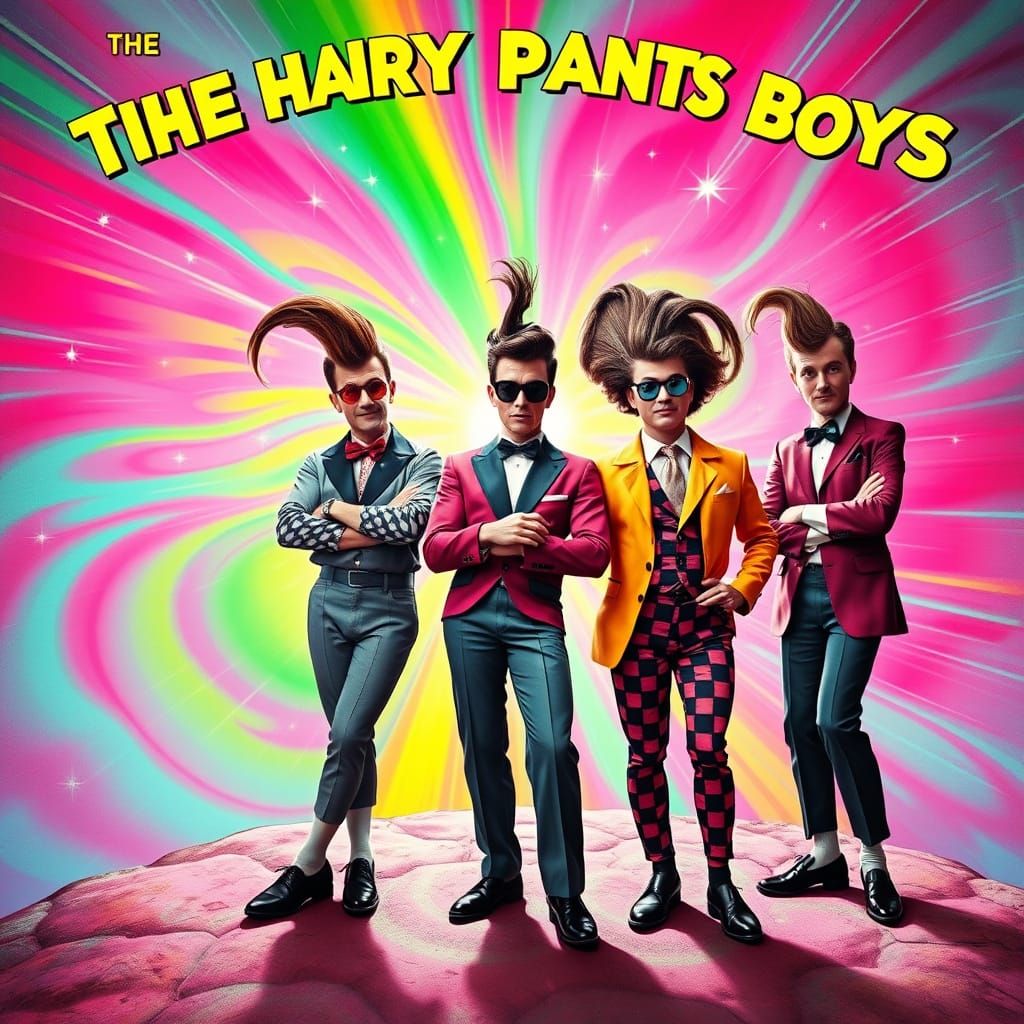 This image shows a 1950s rockabilly band in bold, clashing costumes, surrounded by a swirling vortex of pink, green, and blue, evoking a cosmic storm and rainbow. Inspired by Syd Mead's avant-garde styles and Rene Magritte's surrealism, this vibrant album cover is a mashup of 1950s kitsch and psychedelic...