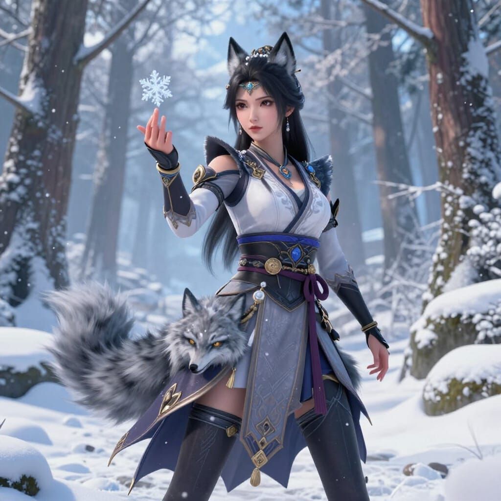 This image shows a powerful female kung fu master in a snowy forest facing a formidable woman in a wolf-themed dress. Rendered in vibrant 3D anime art style with ultrafine detail.