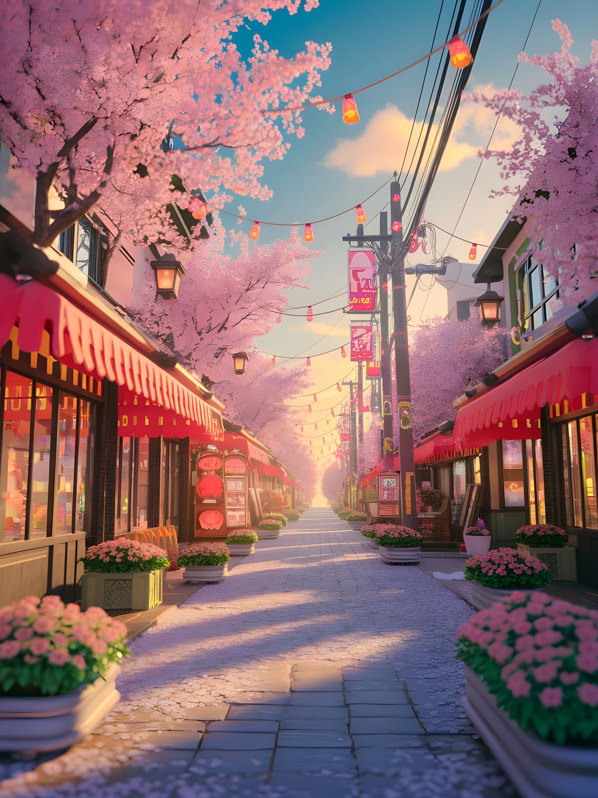 A dreamy Japanese street scene during cherry blossom season, with vibrant flowers, neon signs, and traditional lanterns, evoking a warm and whimsical atmosphere reminiscent of anime and Ghibli art.