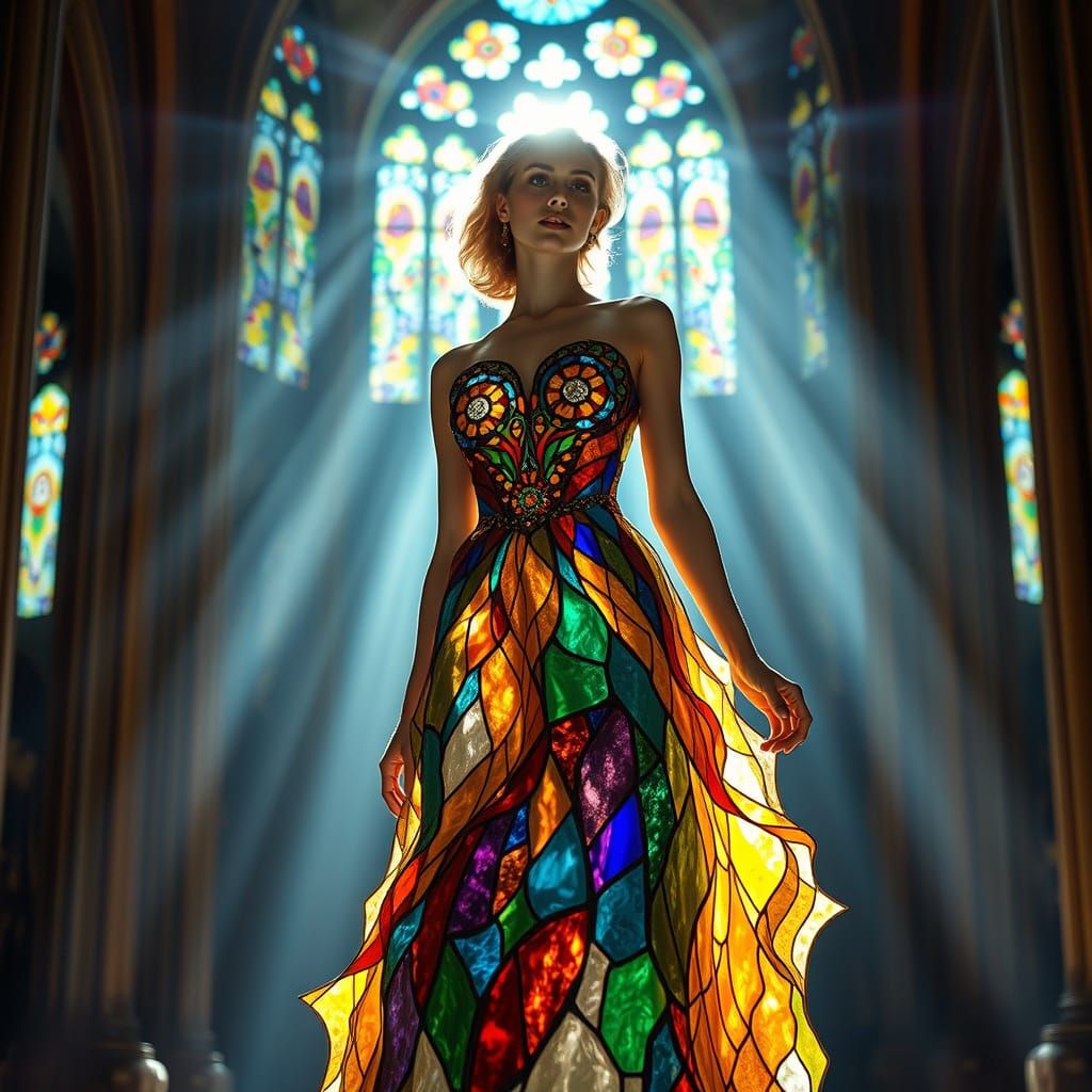 A woman stands in a sunlit cathedral wearing a dress made of vibrant stained glass. Light streams through, creating kaleidoscopic patterns, in an Art Nouveau style with golden accents.