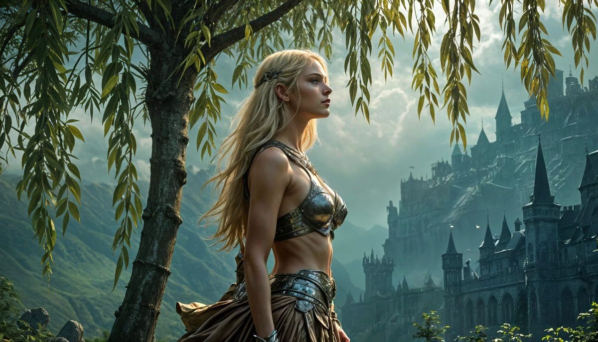 A striking blonde woman with long, flowing hair, dressed in lightweight, feminine fantasy armor, holding a spear or halberd. She glances over her shoulder with a confident and captivating expression. Her armor is a specially crafted set designed for a woman warrior: a form-fitting silver breastplate ...