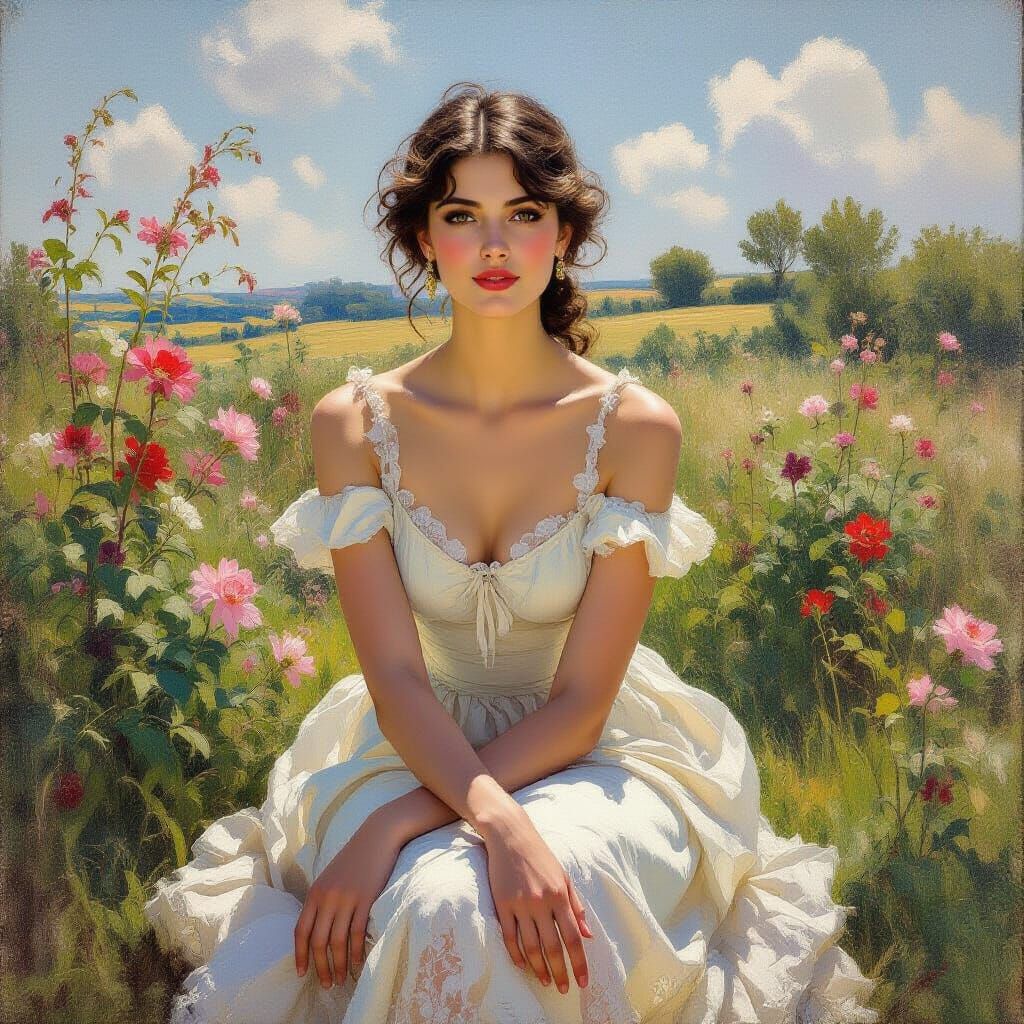 This image shows an elegant woman in a peach-colored lace dress, sitting. The artwork blends impressionistic brushstrokes with vibrant colors and highly detailed textures, bathed in soft light.