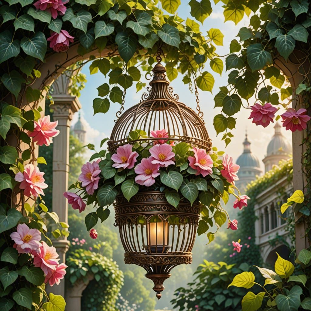 This photorealistic image showcases an ornate, gilded birdcage transformed into a hanging planter. Lush ivy and vibrant pink flowers cascade from it, bathed in soft, heavenly sunlight.