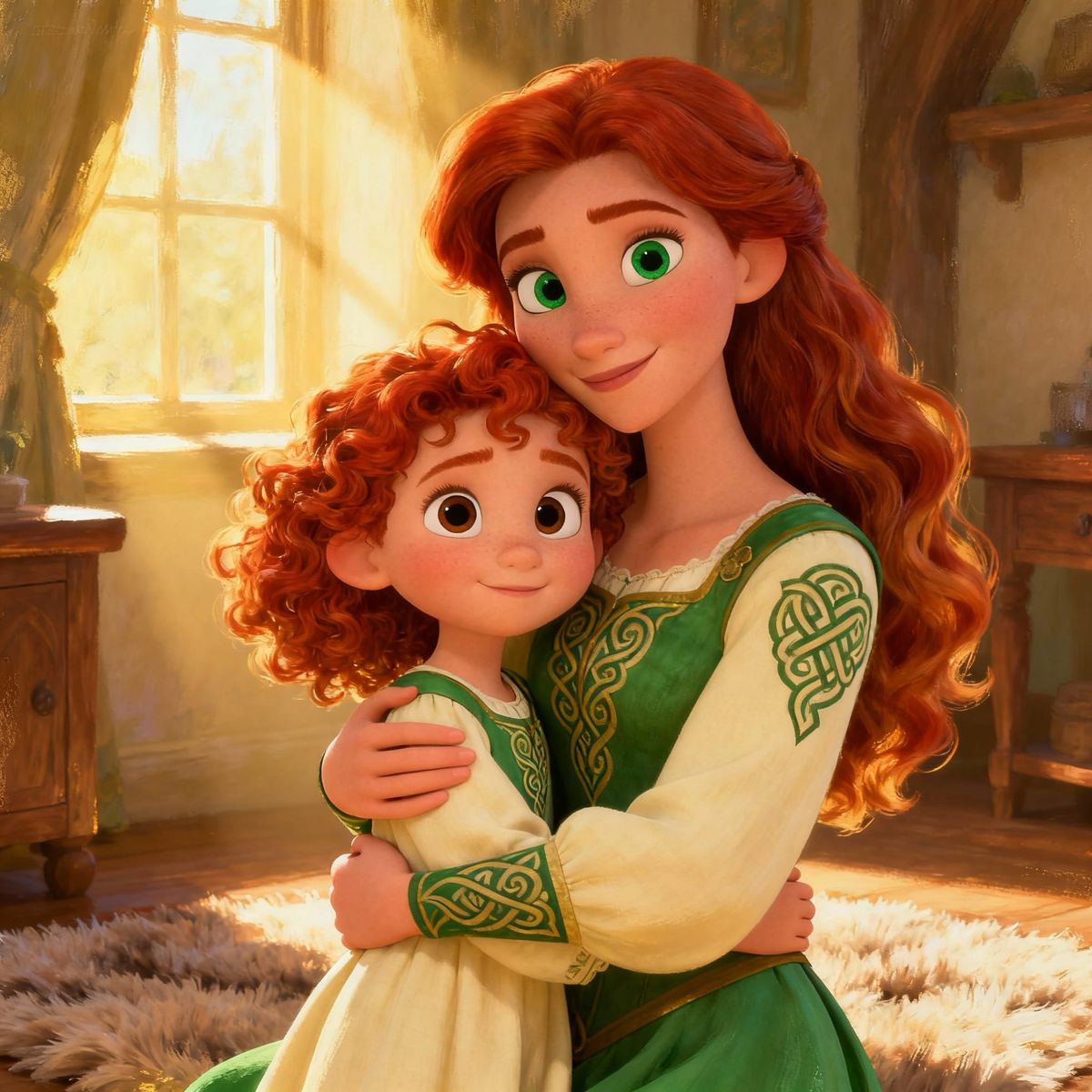 A heartwarming image depicting an Irish mother with red hair holding her young daughter in a cozy, sunlit home. Rendered in a magical Disney Pixar animation style.