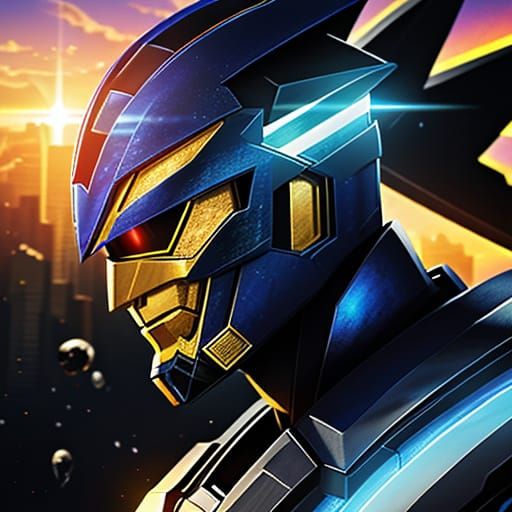 A vibrant digital artwork of a Power Rangers Megazord battle. The metallic Zord robots feature glowing blue lines, set against a sunset backdrop with dynamic lighting and lens flare.