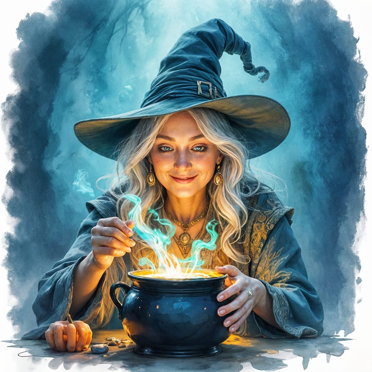This image shows an old, kind witch pouring a glowing potion. It features soft, textured watercolor strokes and dramatic lighting, reminiscent of painterly concept art.