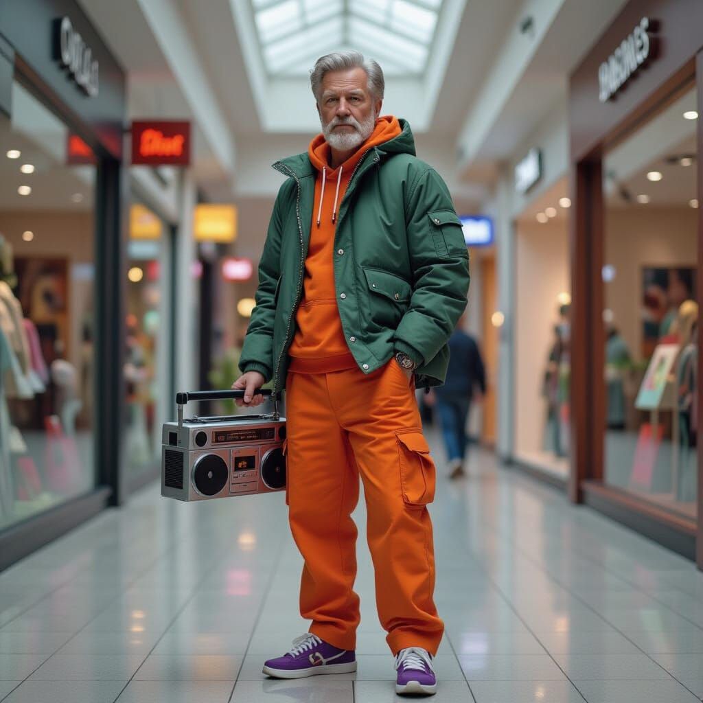 This image shows a middle-aged man in a green jacket, orange trousers and purple sneakers standing in a stylized 80s shopping mall holding a boombox. The image is an impasto painting with thick layers of paint.