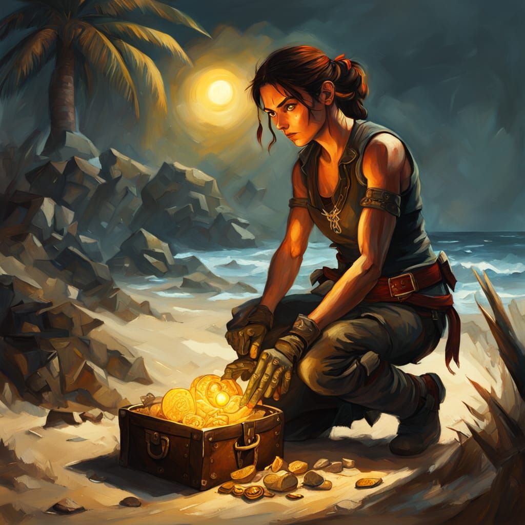 This image shows Lara Croft as a pirate burying treasure on a deserted island. The artwork features golden lighting, intricate details, and deep shadows reminiscent of Baroque painting.