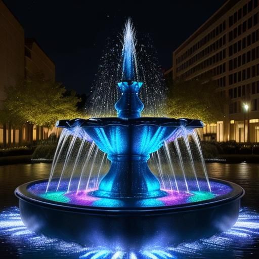 A vibrant water fountain sculpture illuminated at night in a city. The image captures a breathtaking urban scene with complex waterworks and colorful lights.