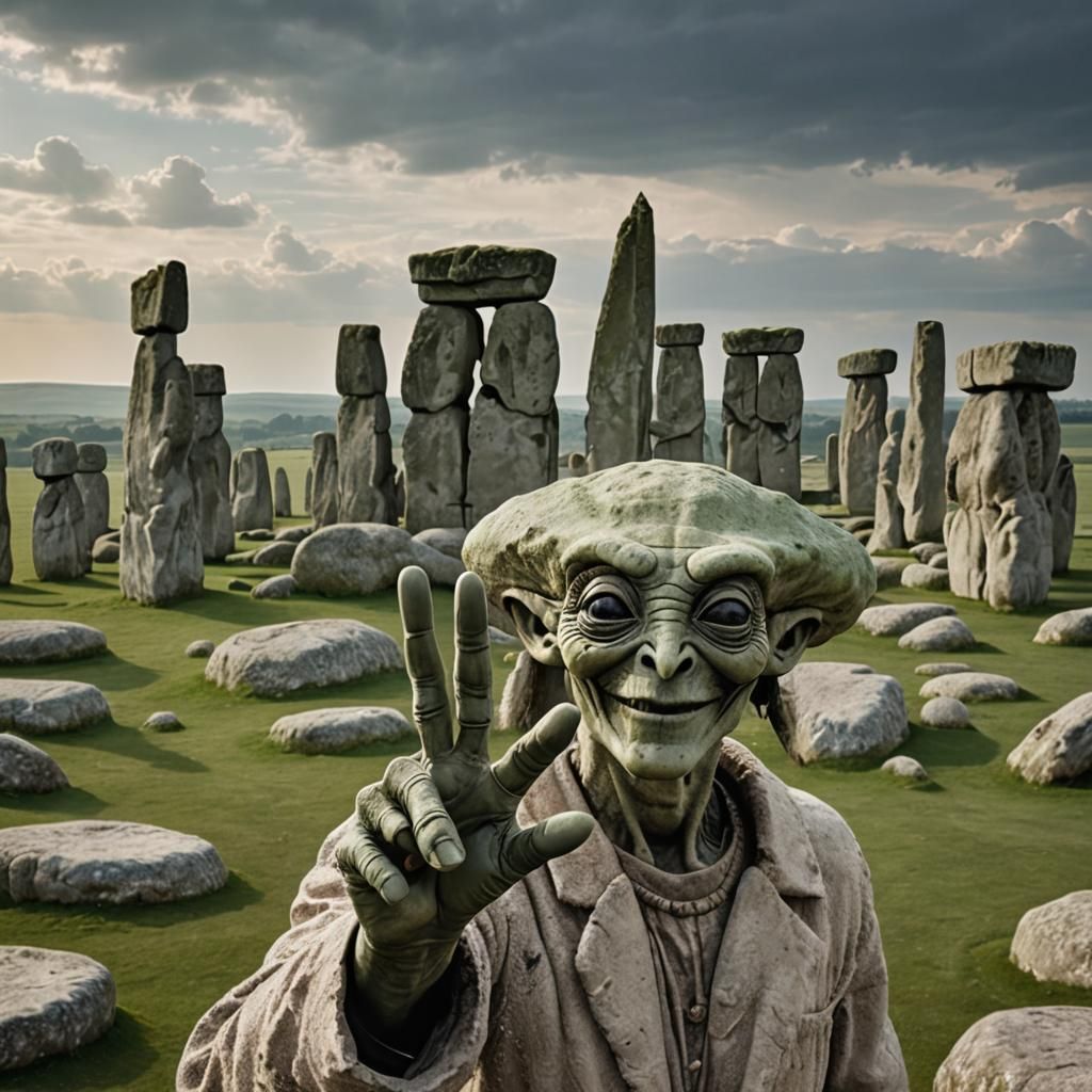 This image shows a realistic scene with Stonehenge in the background and an alien in the foreground flashing a peace sign. Alien lights fill the sky, creating an immersive extraterrestrial scene.