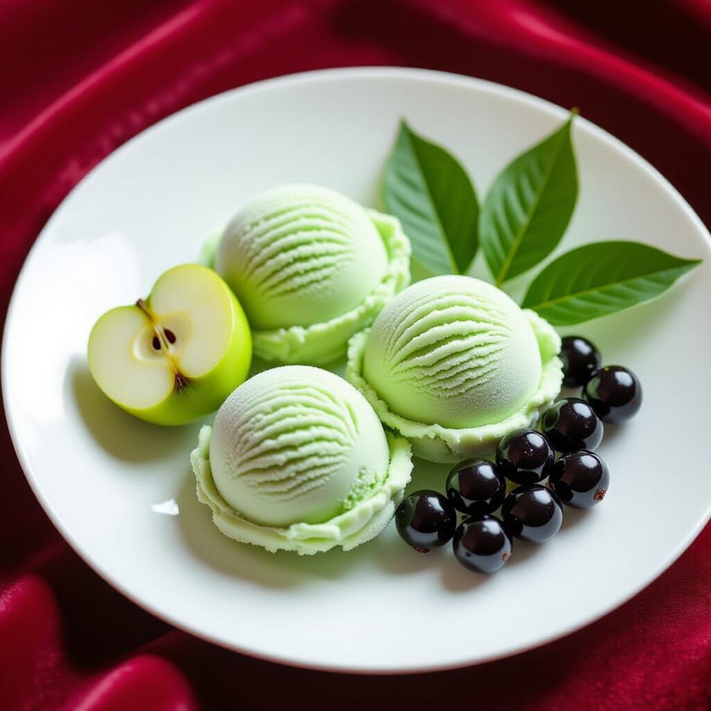 A vibrant serving of light green ice cream on a white plate, accompanied by a sliced green apple and blackcurrants. Fresh leaves add to the playful and lush aesthetic.
