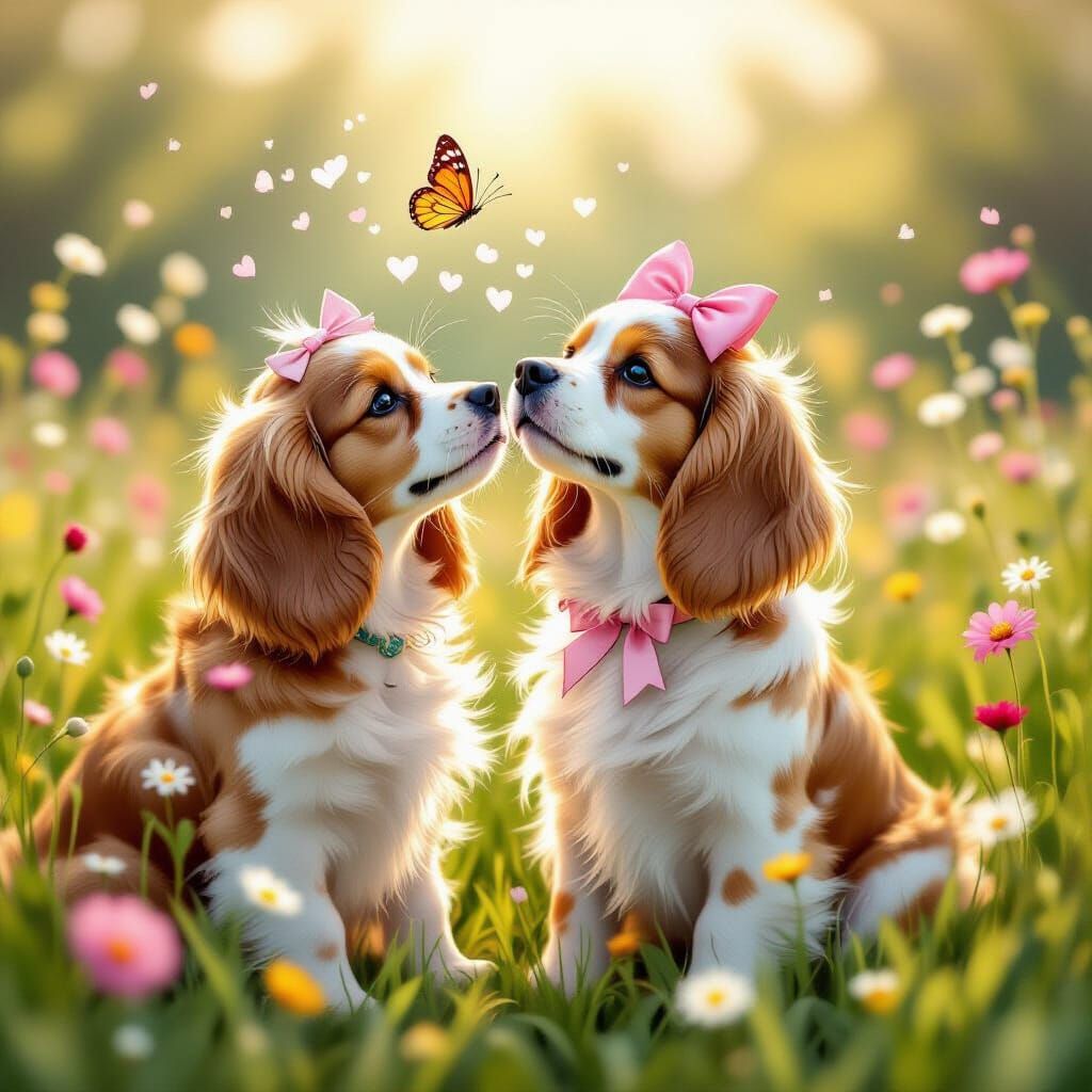 This image shows a golden English Cocker Spaniel with a pink bow, receiving gentle butterfly kisses in a vibrant wildflower meadow. Rendered in a whimsical, illustrative storybook style with soft light.