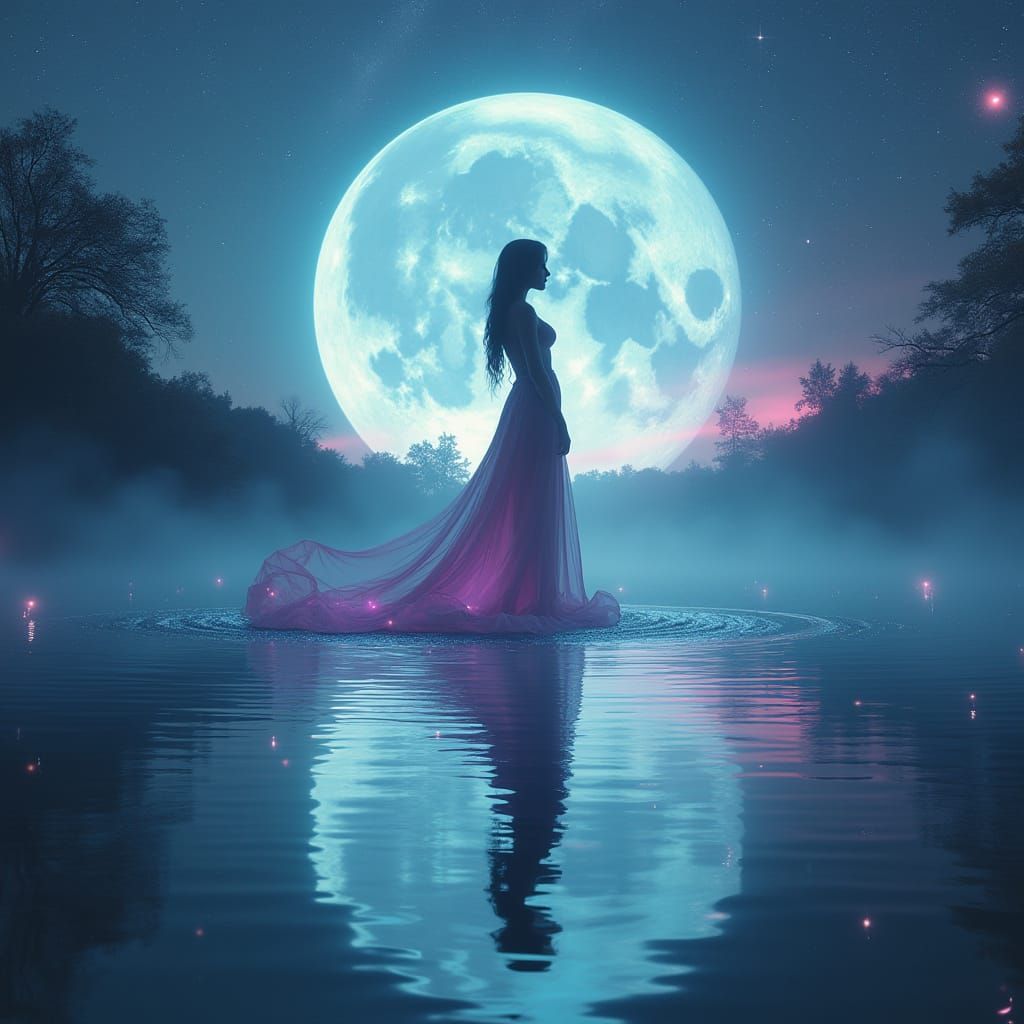 A glowing woman floats on a mirrored lake under a massive moon, reflecting stars and galaxies. The image evokes a dreamlike fantasy with neon lights and swirling mist, in a cinematic style.