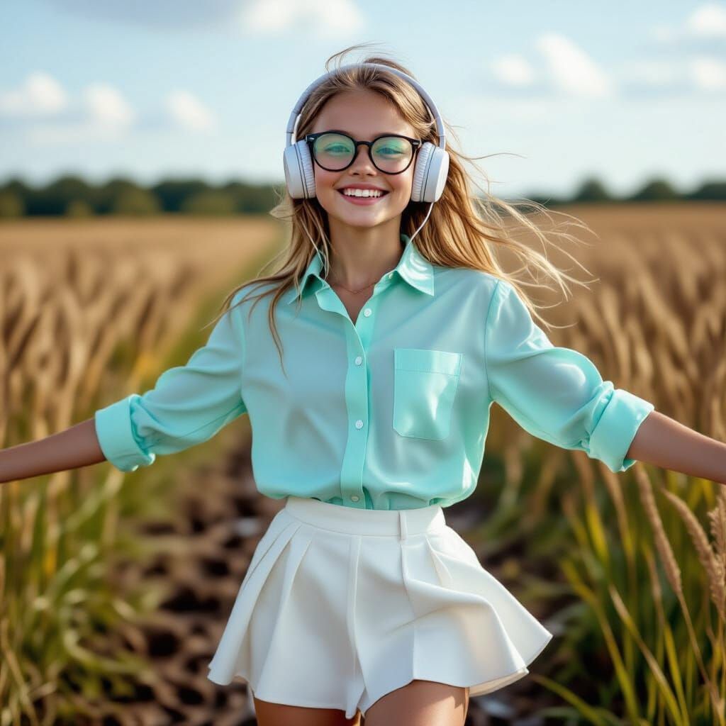 This image shows a young girl with glasses and dental braces, dancing in a muddy field. She is wearing a Ralph Lauren shirt and skirt stained with mud, in a style reminiscent of natural, candid photography.