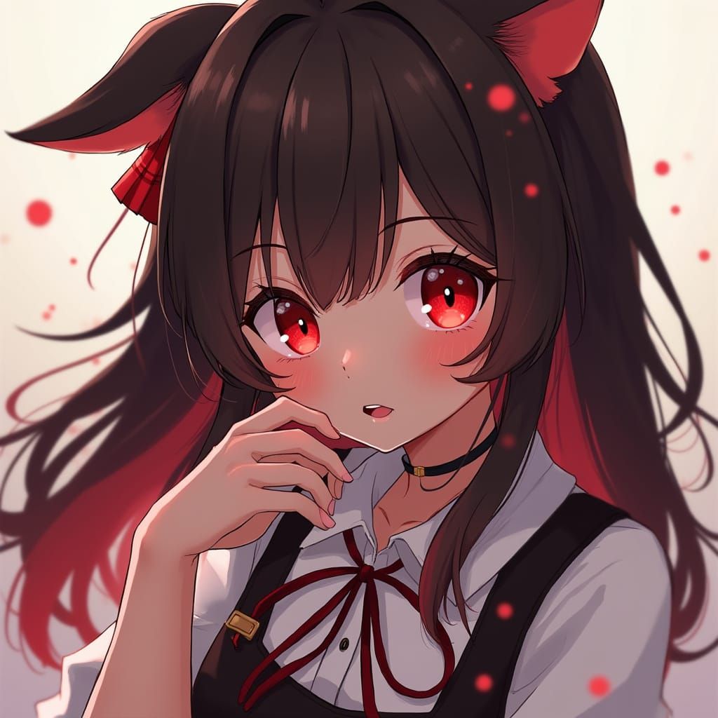 This image shows a cute anime-style cat-girl with black skin, brown hair and red eyes. She is wearing a cute outfit and rendered with vibrant colors and intricate details in a realistic anime style.