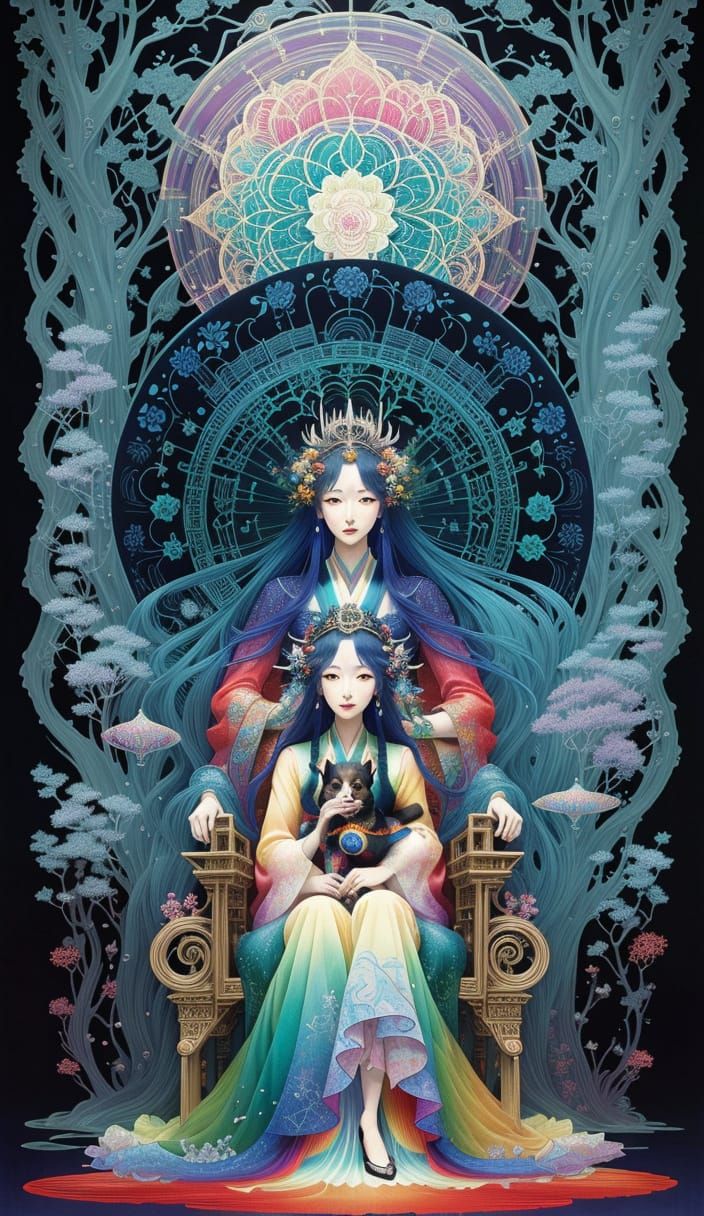 A vibrant image features a woman in a rainbow gown with her dog, seated in a surreal chair. The scene is rich with color, intricate details, and delicate carvings in a fairytale style.