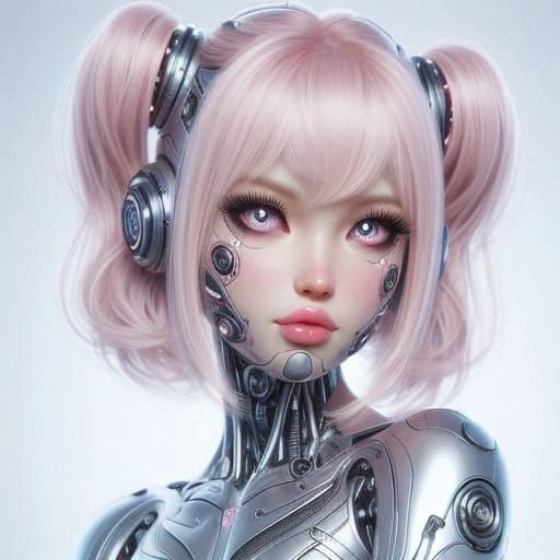 This image depicts a futuristic cybernetic girl with a blend of organic and metallic features, set against a sci-fi background. Her pastel pink hair and expressive synthetic eyes convey a sense of sadness and seduction, while her intricate wiring and glowing circuitry add to the high-tech aesthetic.