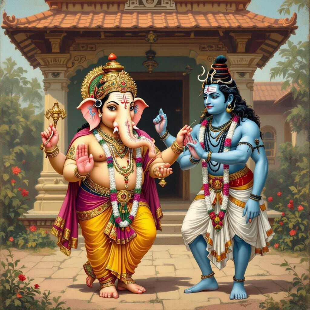 A vivid image shows Lord Ganesha in ornate clothing, preventing Shiva from entering a traditional Indian house. The artwork blends vibrant colors with intricate details, reminiscent of classical Indian art.