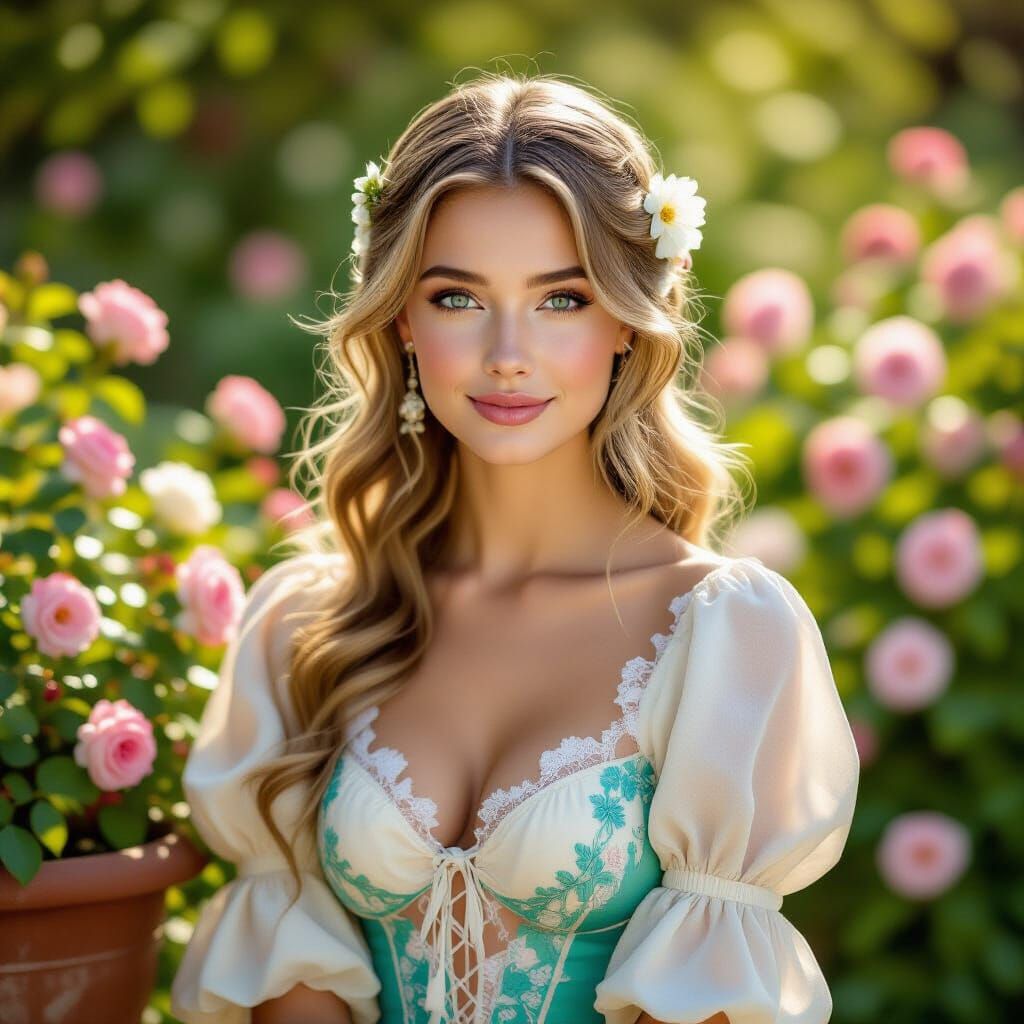 A striking portrait photograph in the style of Annie Leibovitz, capturing a young Caucasian woman with fair skin and flowing wavy blonde hair, a single, delicate white flower artfully woven amongst her locks. She wears a classic cream blouse with softly puffed sleeves, layered over a seductive turquoise ...