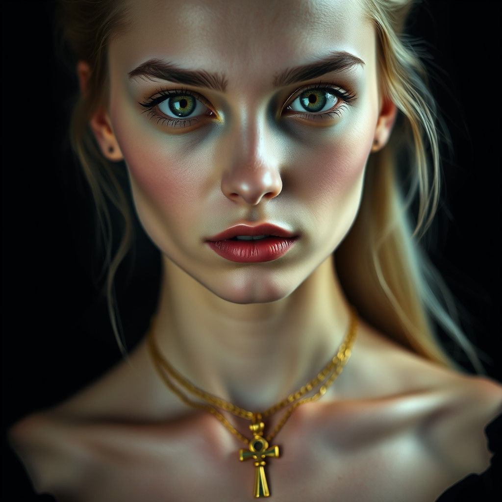 a vibrant professional studio portrait photography of a young, pale, goth, attractive, friendly, casual, delightful, intricate, gorgeous, female, piercing green eyes, wears a gold ankh necklace, femme fatale, nouveau, curated collection, annie leibovitz, nikon, award winning, breathtaking, groundbreaking, ...