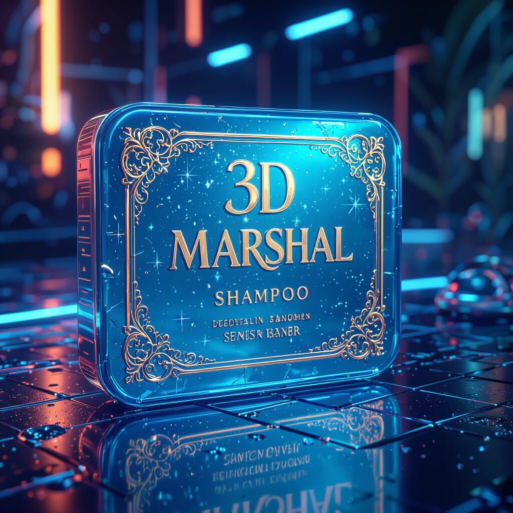 This image shows a holographic 3D business card model for MARSHAL shampoo. The card features bright blue and turquoise metallic sheens and ornate fonts, presented in a futuristic, neon-lit style.