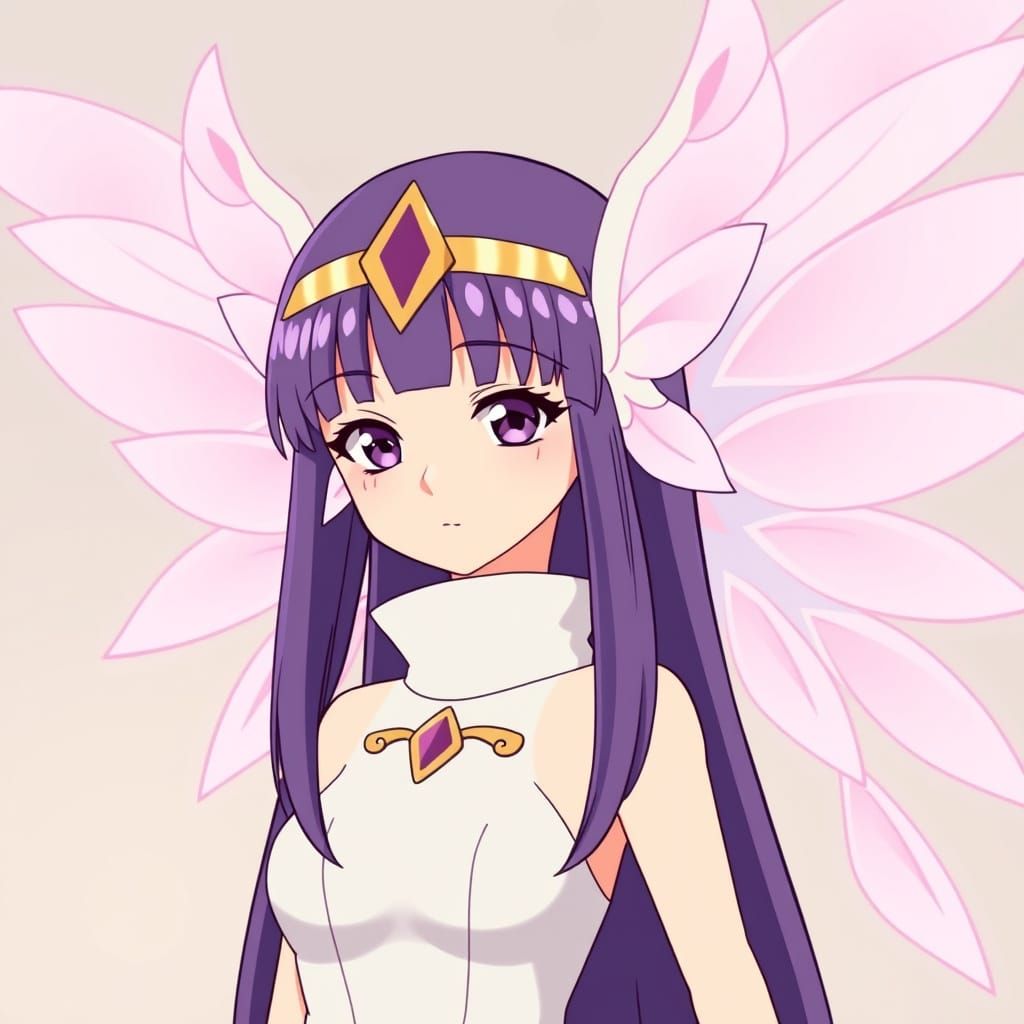 A captivating anime illustration of a young woman with delicate, slightly translucent pink and cream fairy wings, long purple hair, and piercing purple eyes, showcasing a serene and innocent gaze reminiscent of One Piece's iconic female characters.
