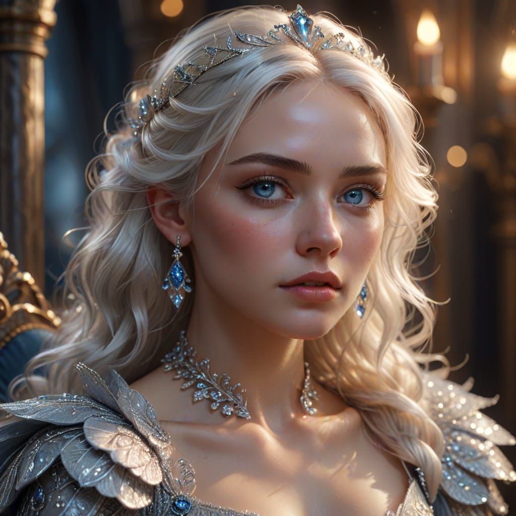 This image is a masterfully rendered, photorealistic portrait of a young woman with crystal blue eyes and white blonde hair, set against a soft, golden light and delicate, sparkling tears. Created in a hyperrealistic digital art style with smooth gradients and subtle textures, this image captures the ess...