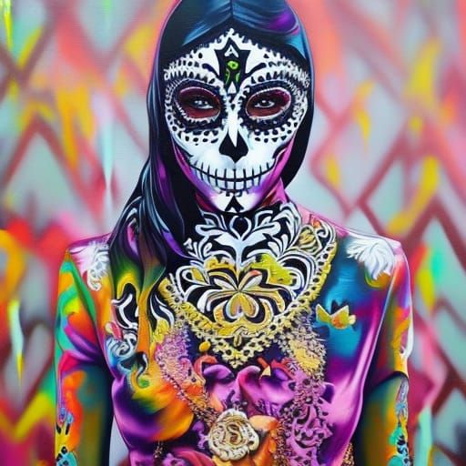 This image shows ladies at a Día de los Muertos festival. The artwork has a graffiti and street art aesthetic, with high contrast and colorful, ultra-detailed textures.